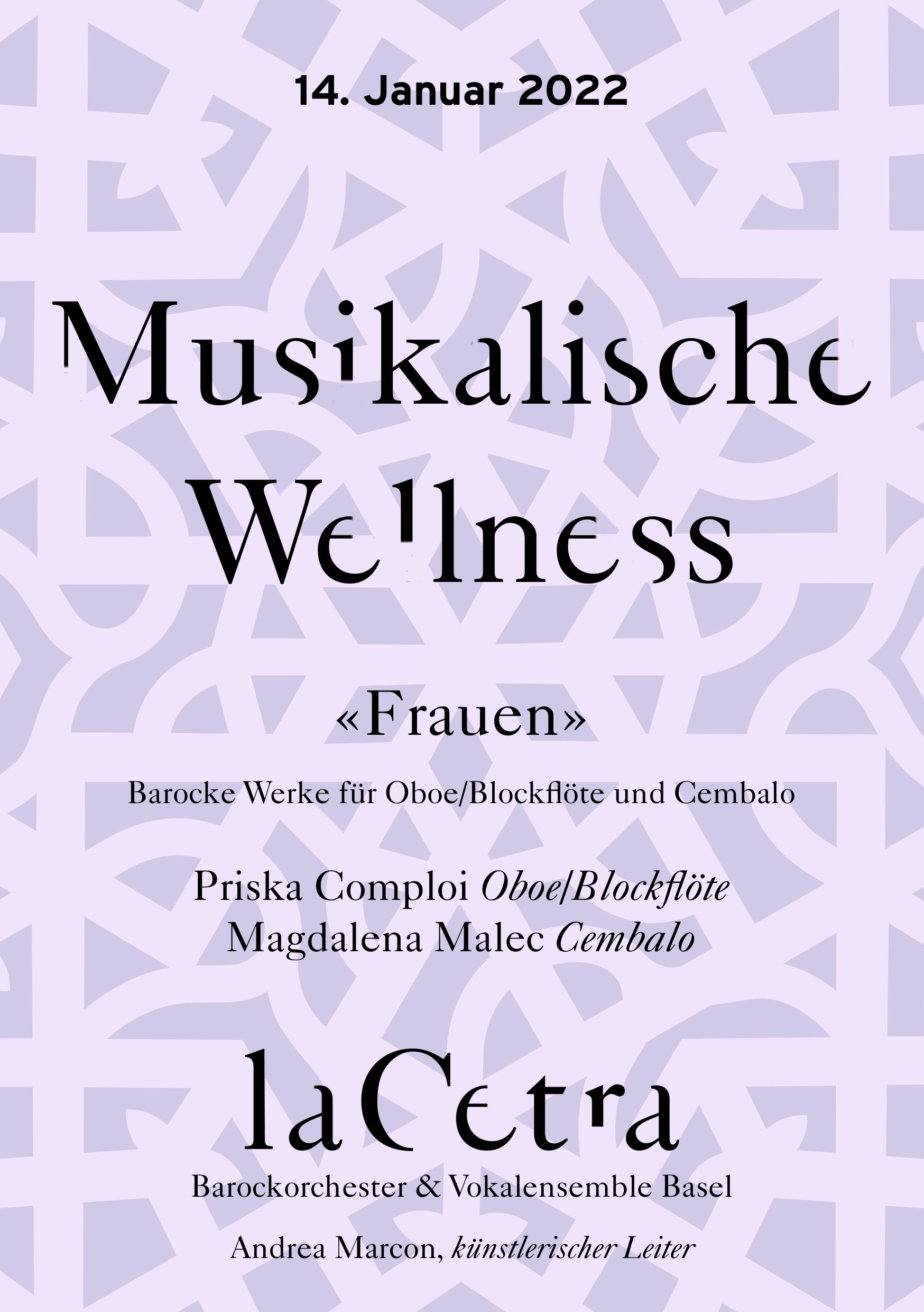 Friday, 14. January 2022 16:30 La Cetra, Studio MusicArte, Basel Musikalische Wellness – Priska Comploi & Magdalena Malec