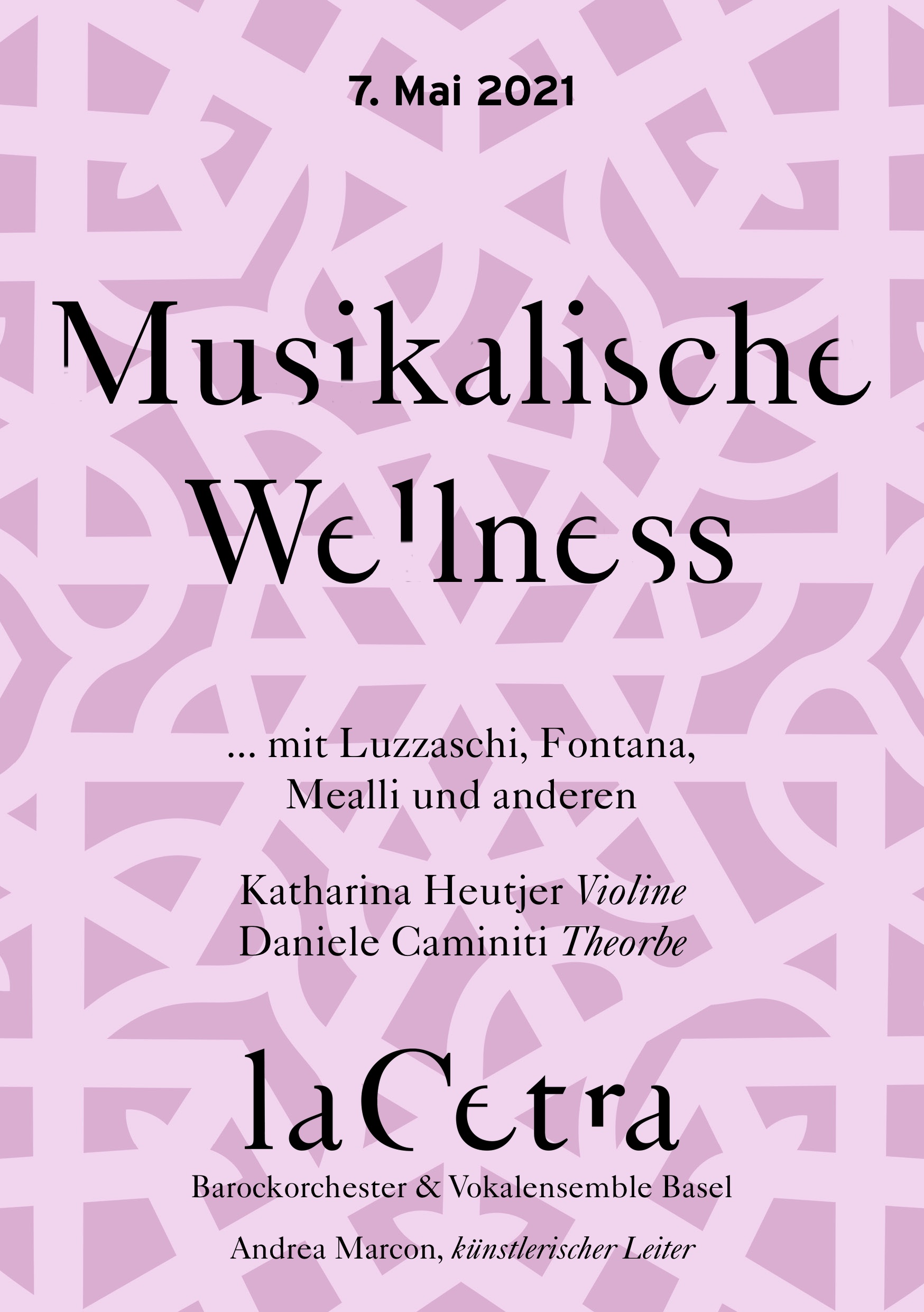 Sunday, 2. May 2021 19:30 La Cetra - Studio MusicArte, Basel Musikalische Wellness mit Luzzaschi, Fontana, Mealli und anderen